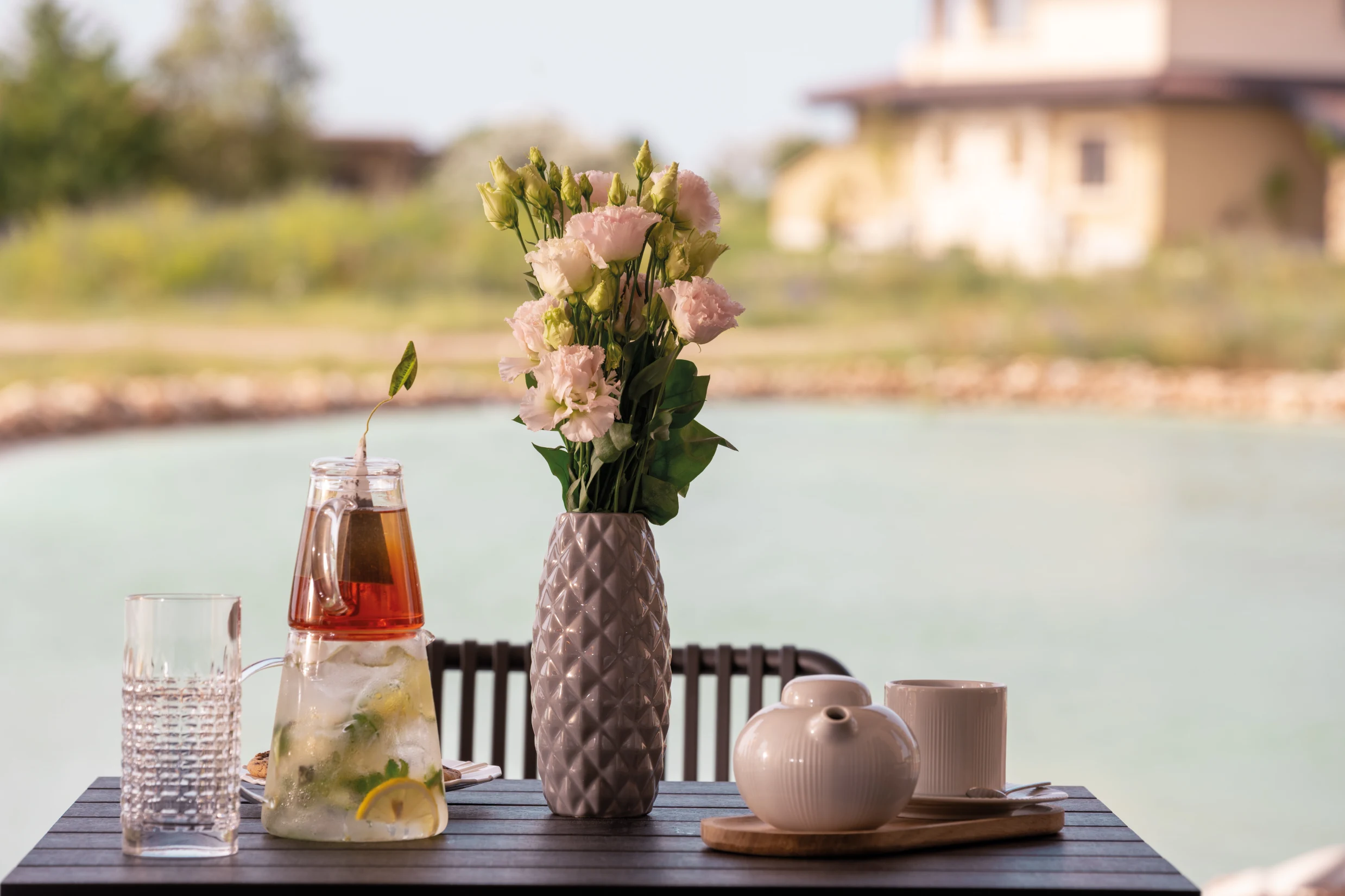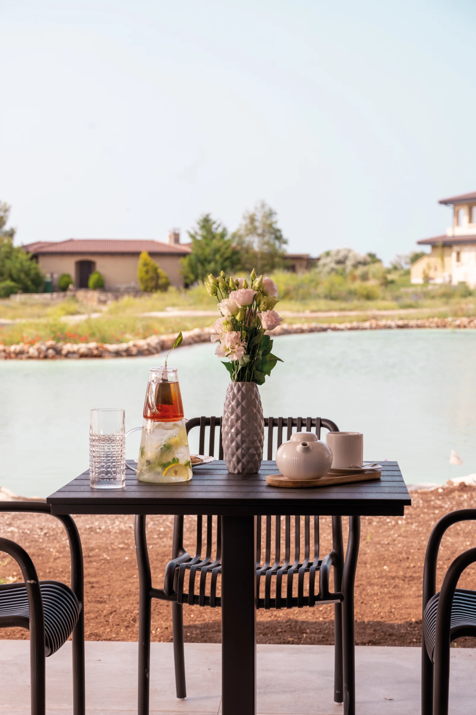 Веранда с градински мебели точно на брега на езерото